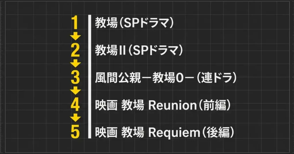 | ② 時系列順 | 1. 教場0(連ドラ) 2. 教場(SPドラマ) 3. 教場II(SPドラマ) 4. 映画 Reunion(前編) 5. 映画 Requiem(後編) | ・風間公親の人生を追いたい ・2周目の復習視聴 ・事件の因縁を整理したい |